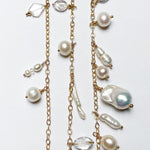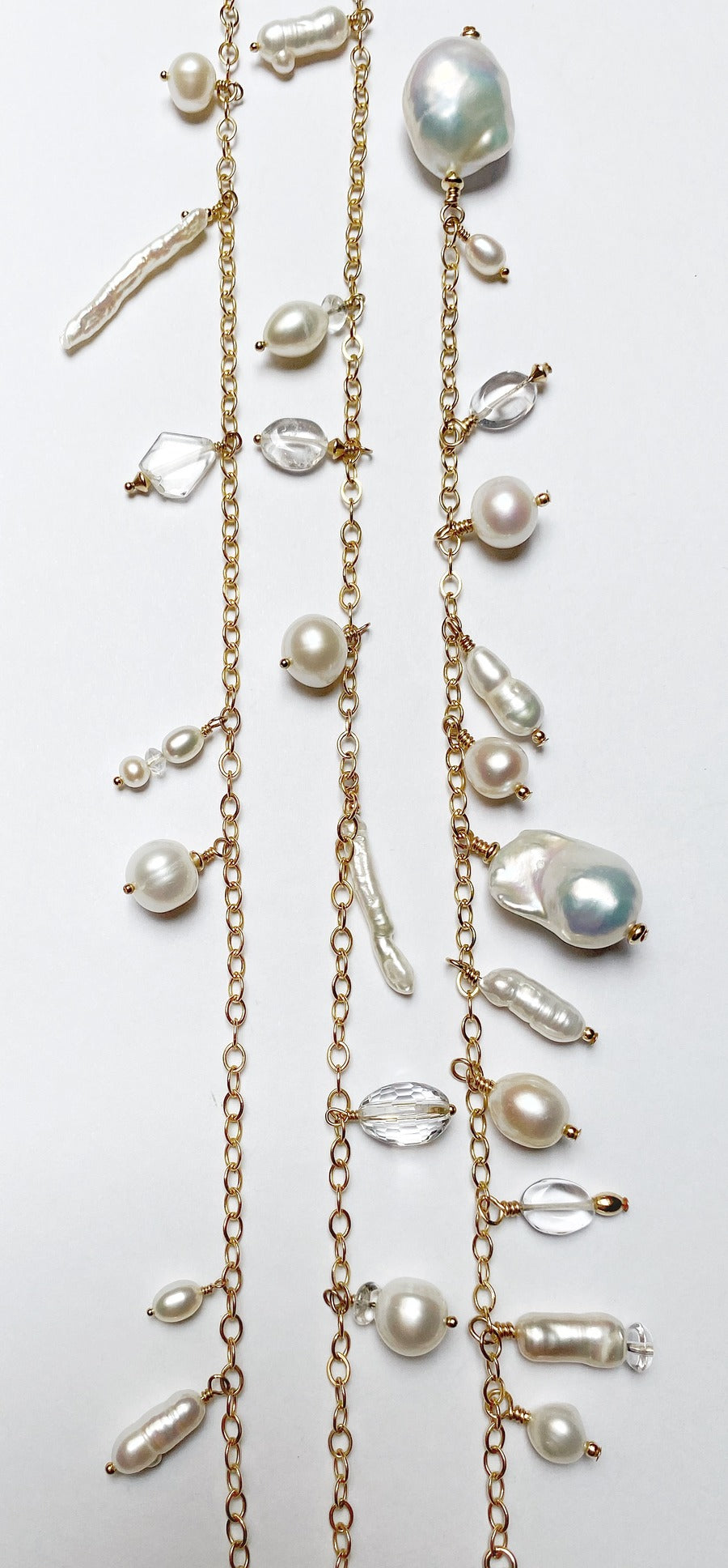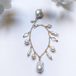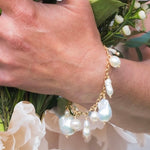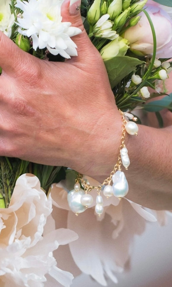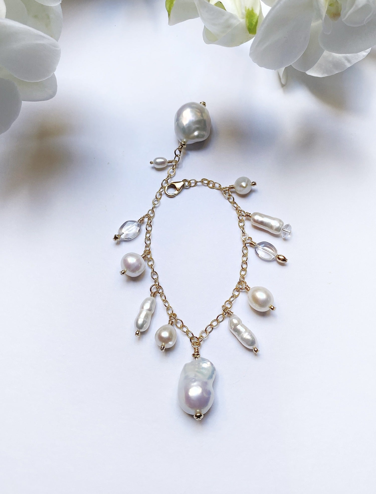 Bracelet Chaîne en Gold-filled, Charms en Perles d'Eau douce, Perles Baroques et Cristal de Roche.