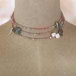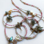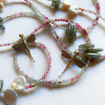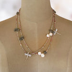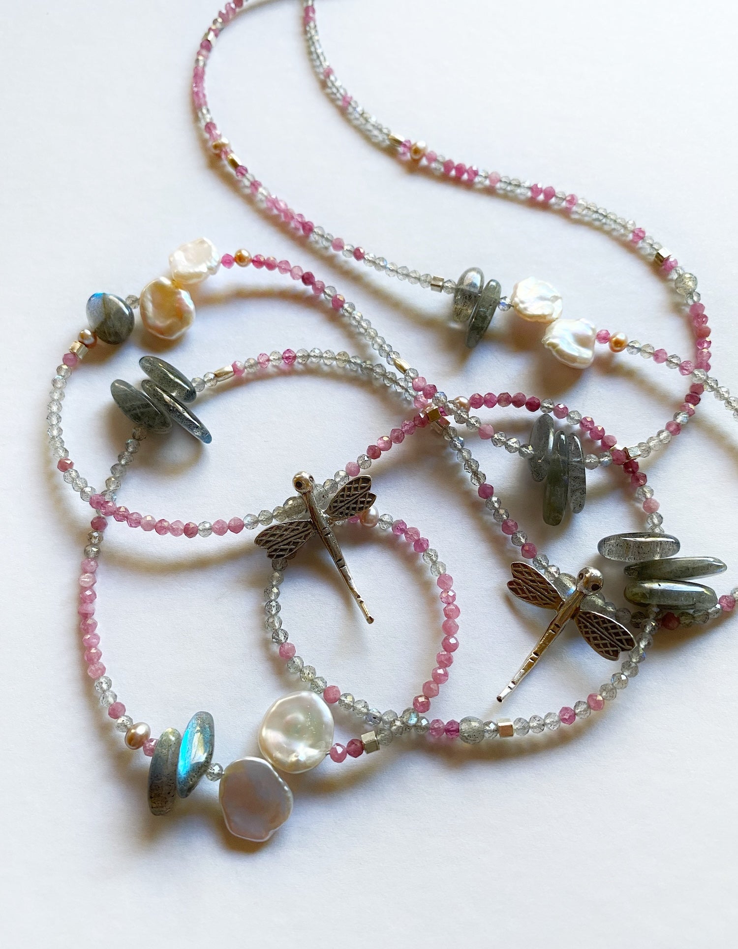 Sautoir en tourmaline rose, labradorite, perles d’eau douce et libellules en argent Hill Tribe.