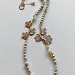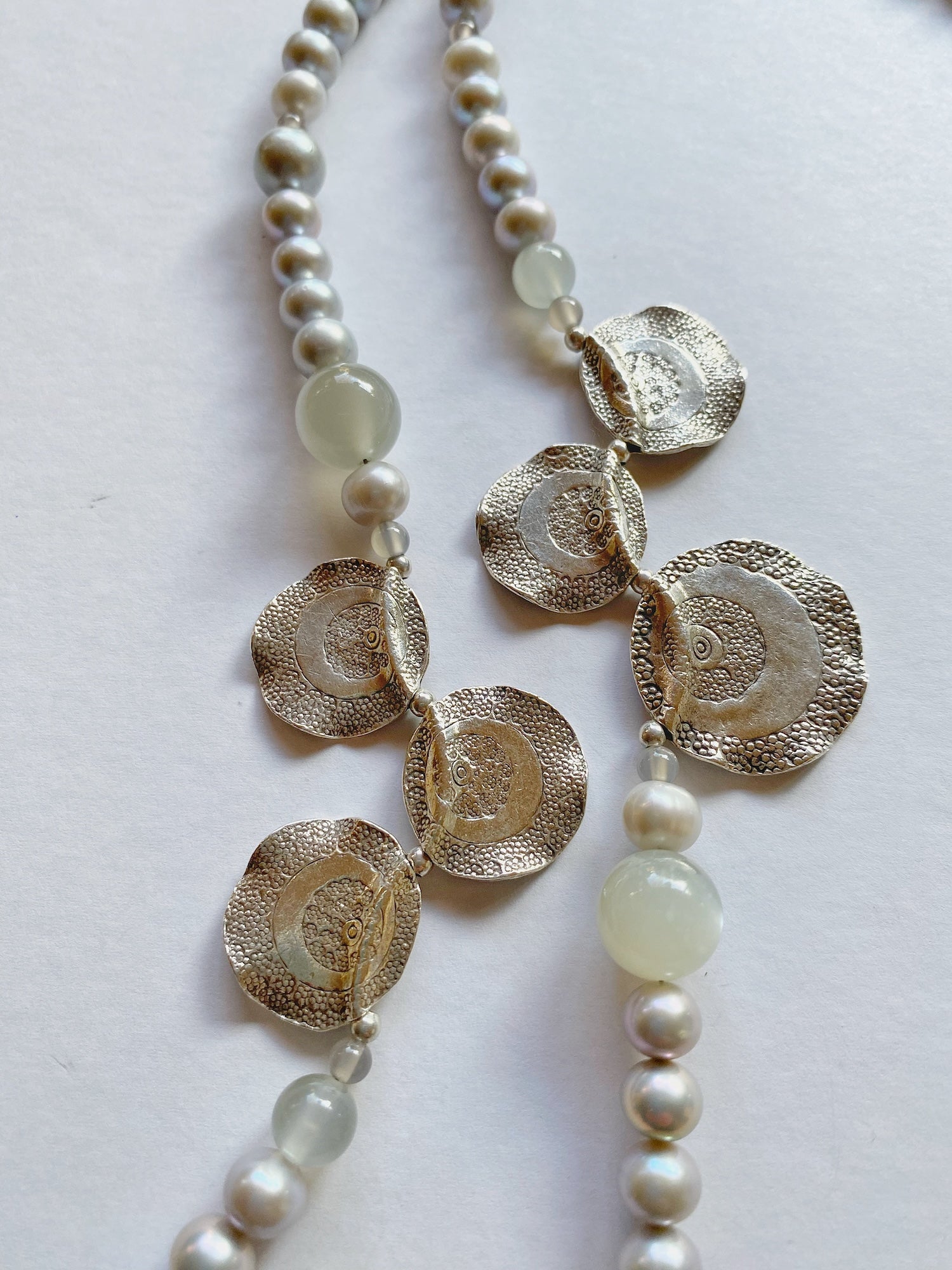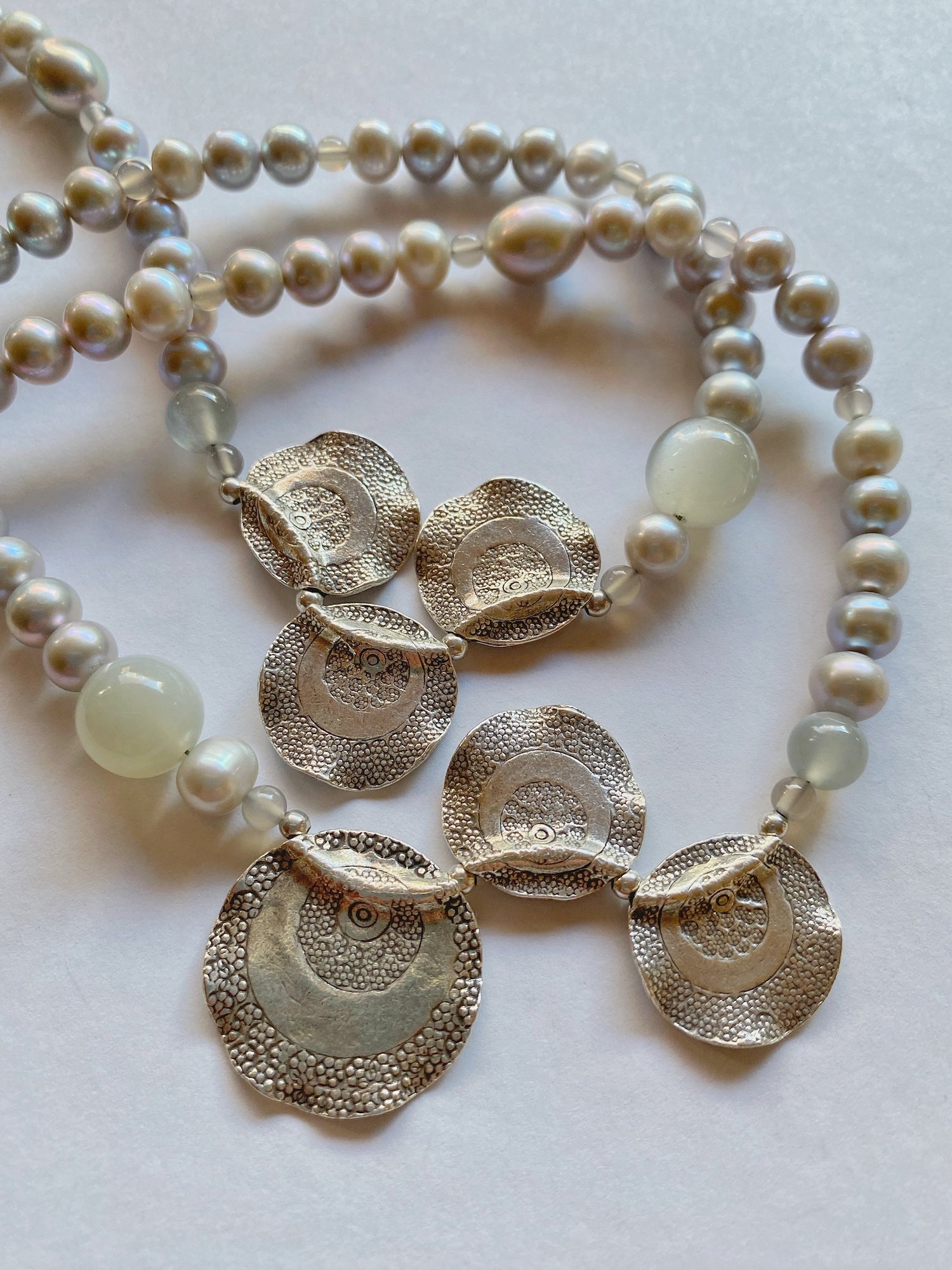 Ce collier onirique a été inspiré par la brume descendant lentement sur les montagnes. J’ai choisi des perles de culture d’eau douce gris clair pour leur lustre délicat, que j’ai associées à des agates grises et à l’éclat éthéré des pierres de lune. Ensemble, elles créent une harmonie de tons subtils et de reflets, évoquant l’atmosphère mystique d’un temps brumeux.