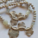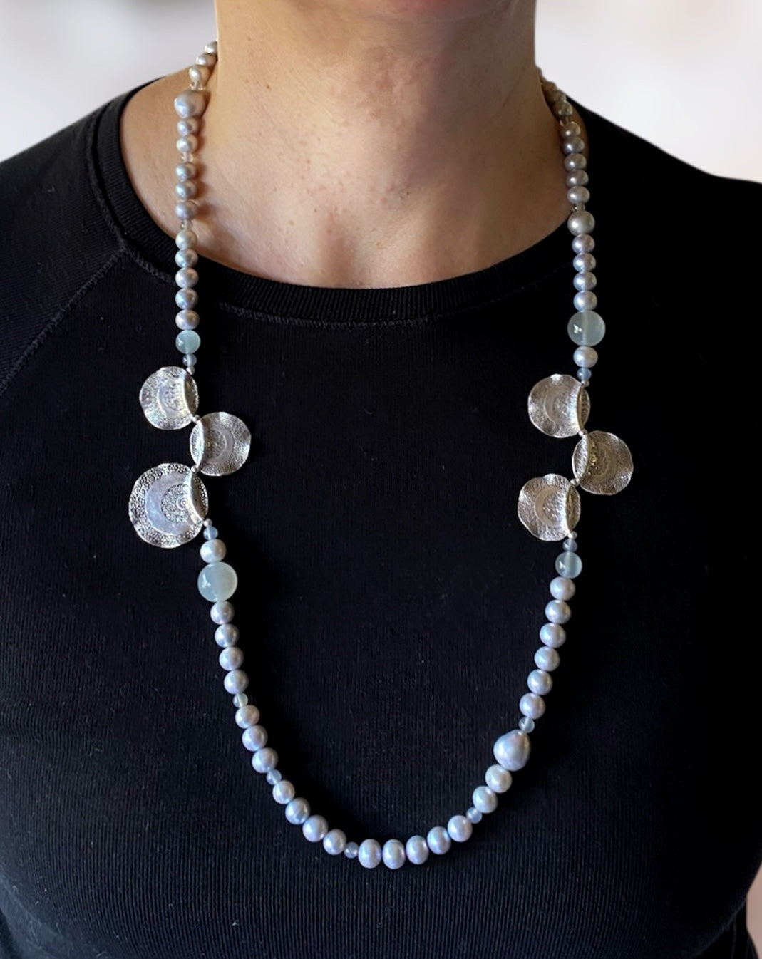 Collier mi-long en perles de culture d’eau douce grises, agates, pierres de lune et argent Hill Tribe.