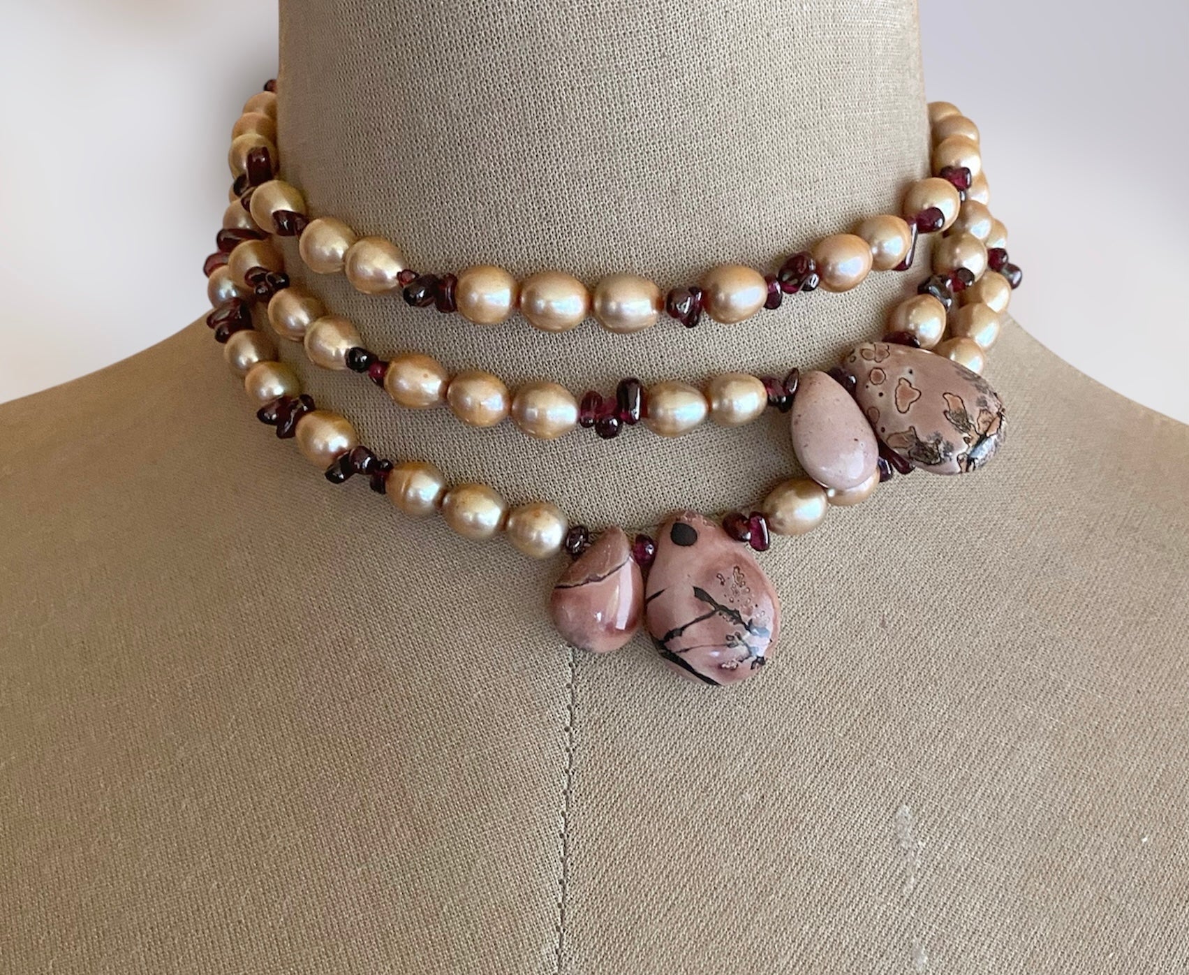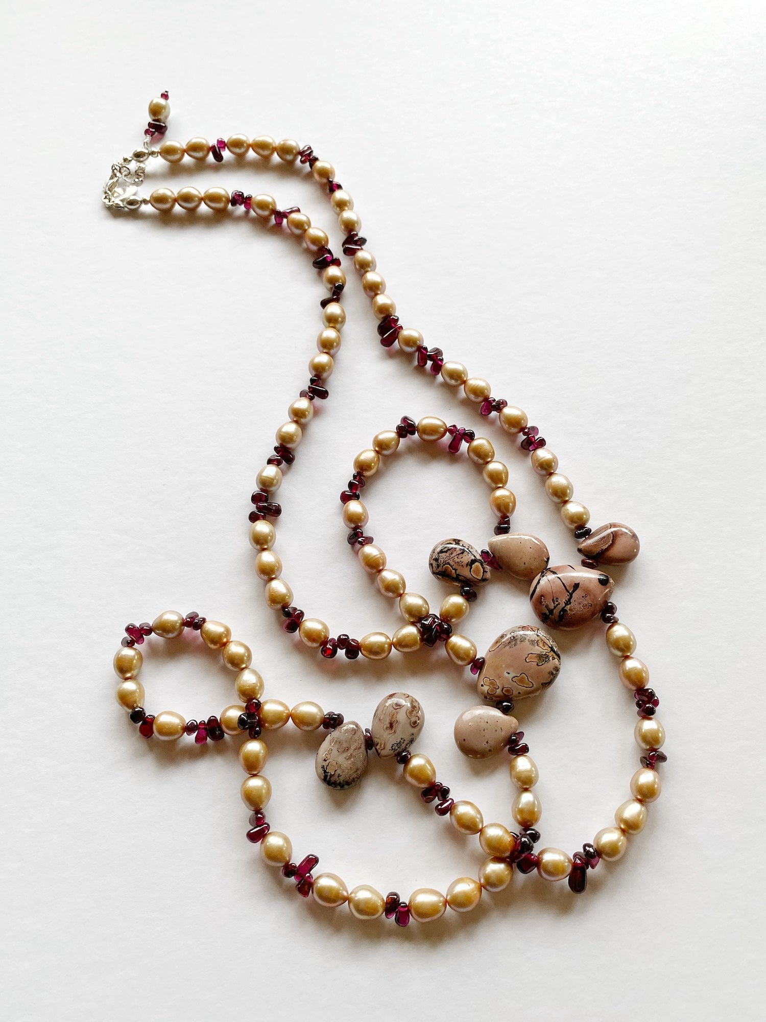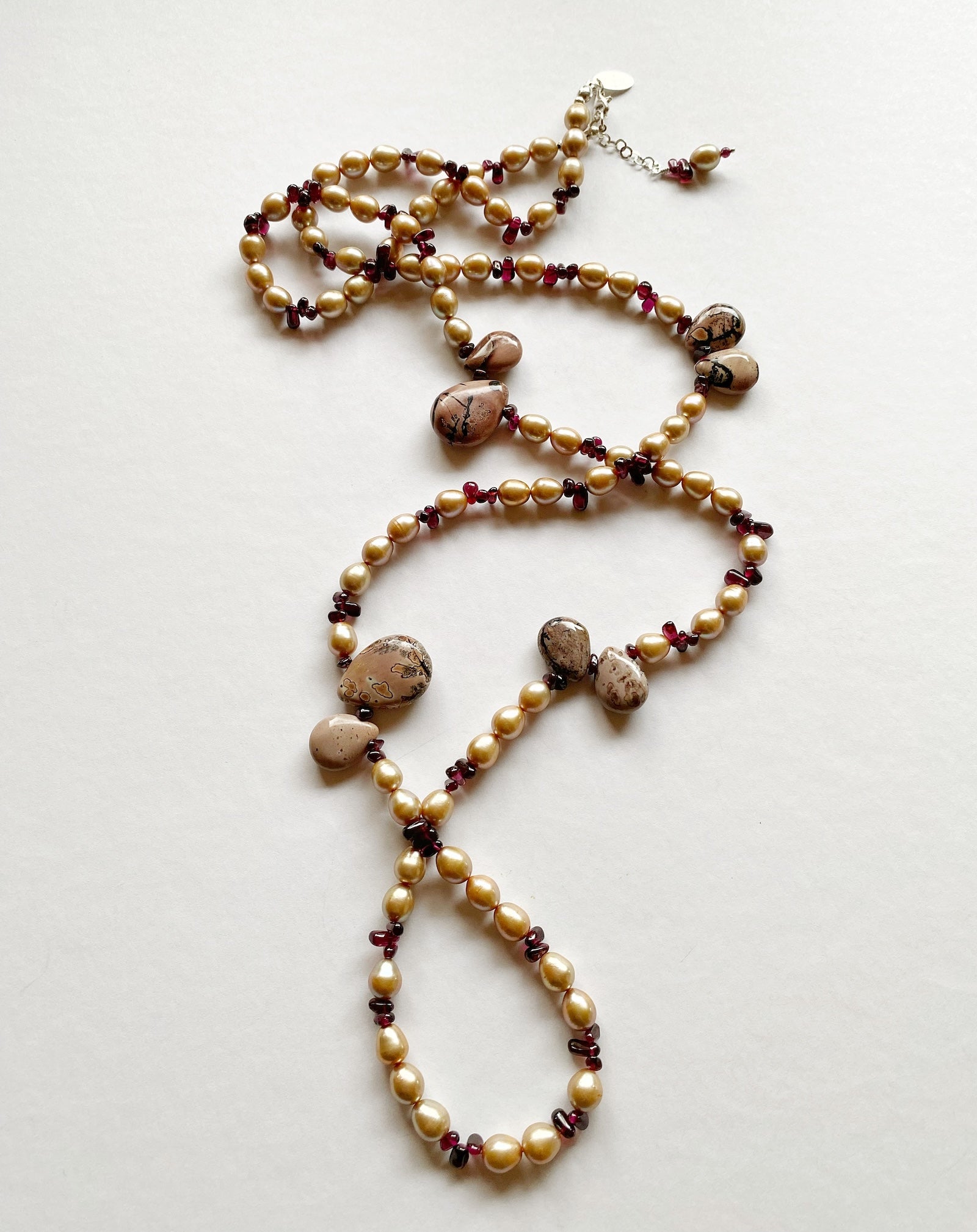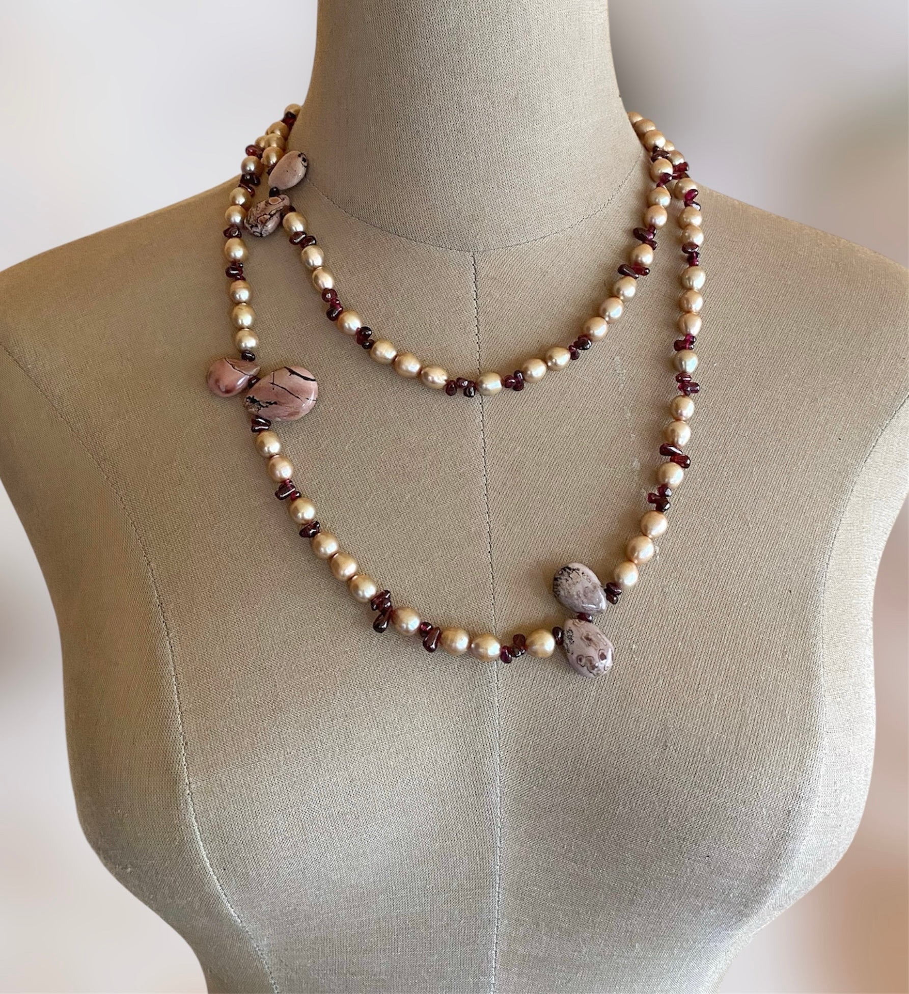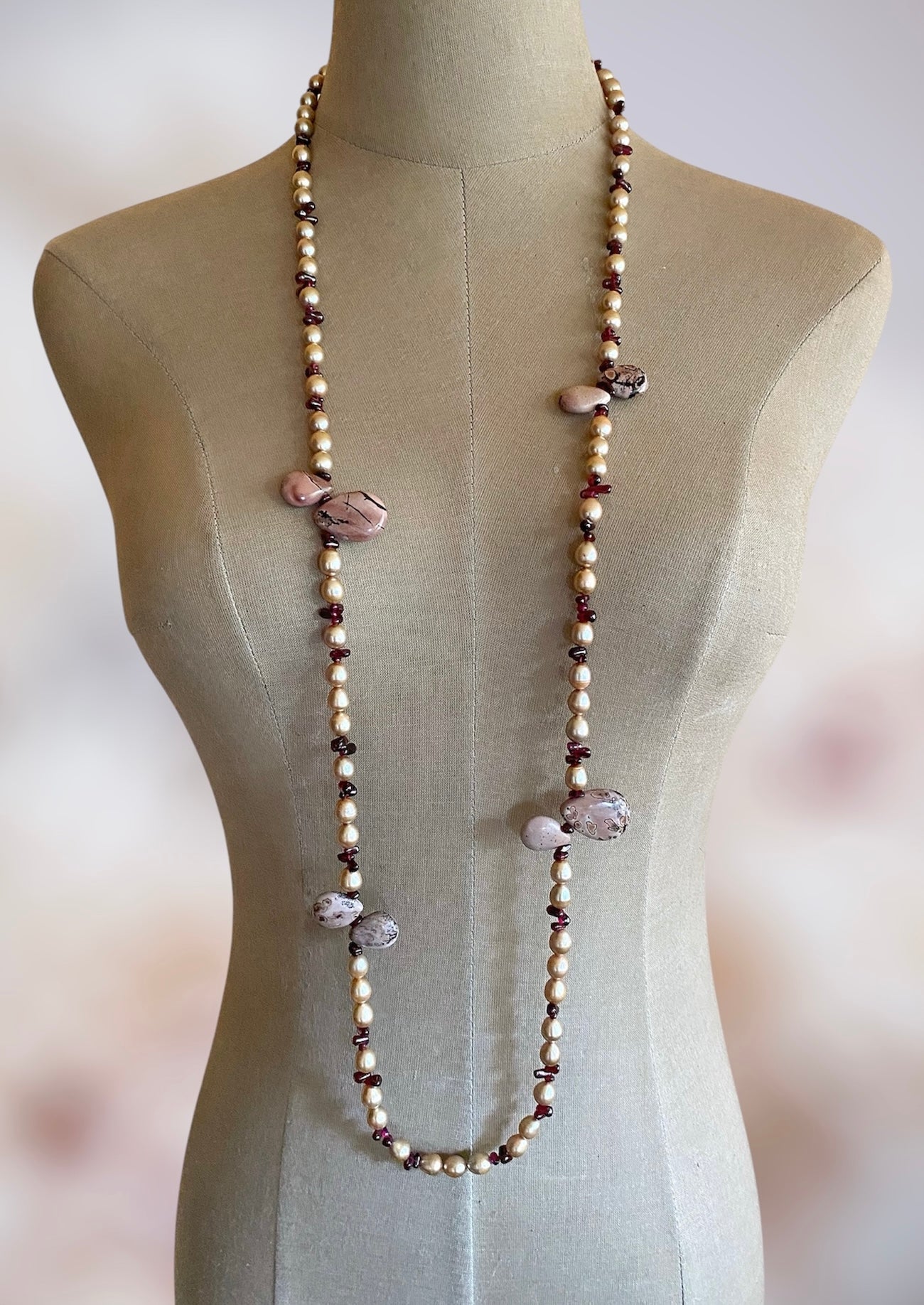Freshwater Pearls, Garnet, Landscape Jasper, Long Necklace
