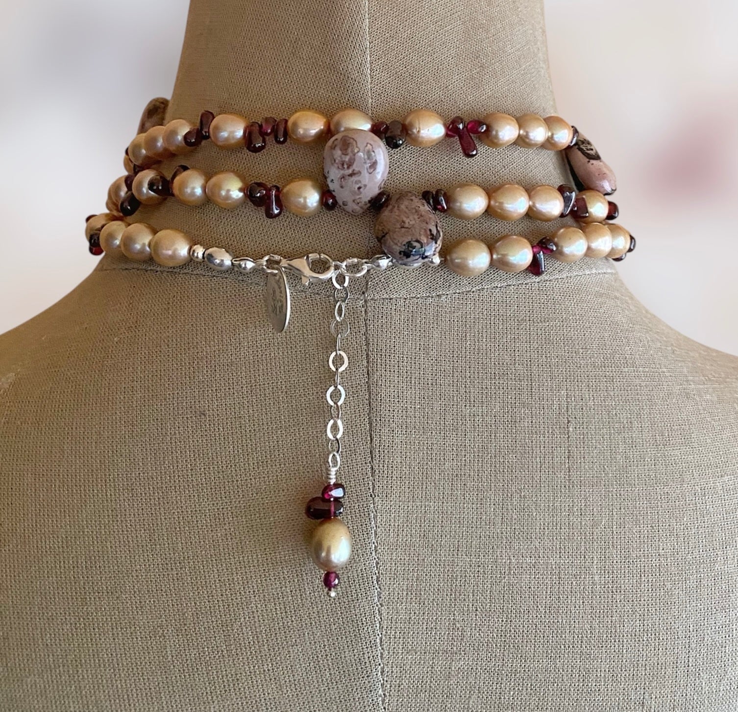 This landscape Jasper has been with me for over twenty years. As with all my gemstones, I wait patiently until the right moment arrives to create with them. I’ve always loved how its markings resemble ancient landscapes. When I finally brought it to the bench, garnet felt like the natural companion. Its deep warmth draws out the rich earth tones of the jasper. Champagne pearls followed, their soft golden glow adding a nurturing energy.